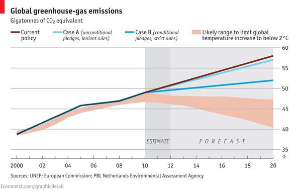 26 november 2012 <div style="display:none">49tjf49edf:text_lang:id</div>Hot and Bothered As tens of thousands of politicians, diplomats, NGO-workers and journalists descend on Doha for the two-week feeding frenzy known as the UN’s annual climate-change summit, the latest report from the UN Environment Programme (UNEP) shows that matters climatic are going from bad to worse. Greenhouse-gas emissions are now about 50 gigatonnes of carbon equivalent (GtCO2e). That is 20% higher than they were in 2000 and, worryingly, 11% higher than where emissions need to be in 2020 in order to ensure global temperatures do not rise by more than 2 degrees Celsius (see light red range in chart). If emissions go on rising at their current rate, they will reach 58 GtCO2e in 2020, 14 GtCO2e more than they need to be then (current policy). In theory, this would not matter too much if greenhouse gases were cut more dramatically later (though costs would be higher). The trouble is that countries are not promising to make big enough cuts. UNEP has looked at the emission-reducing impact of the various promises countries have made since the Copenhagen climate-change conference in 2009. If countries implement their least ambitious pledges and allow lots of loopholes and lenient rules, this will make no real difference: emissions would be only 1 GtCO2e less than business as usual (case A). Even the implementation of the most ambitious pledges, subject to strict rules, would take countries less than half way to where they need to be to keep global temperatures from rising more than 2 degrees (case B). And emissions would still be rising in 2020.Article by: www.economist.com |